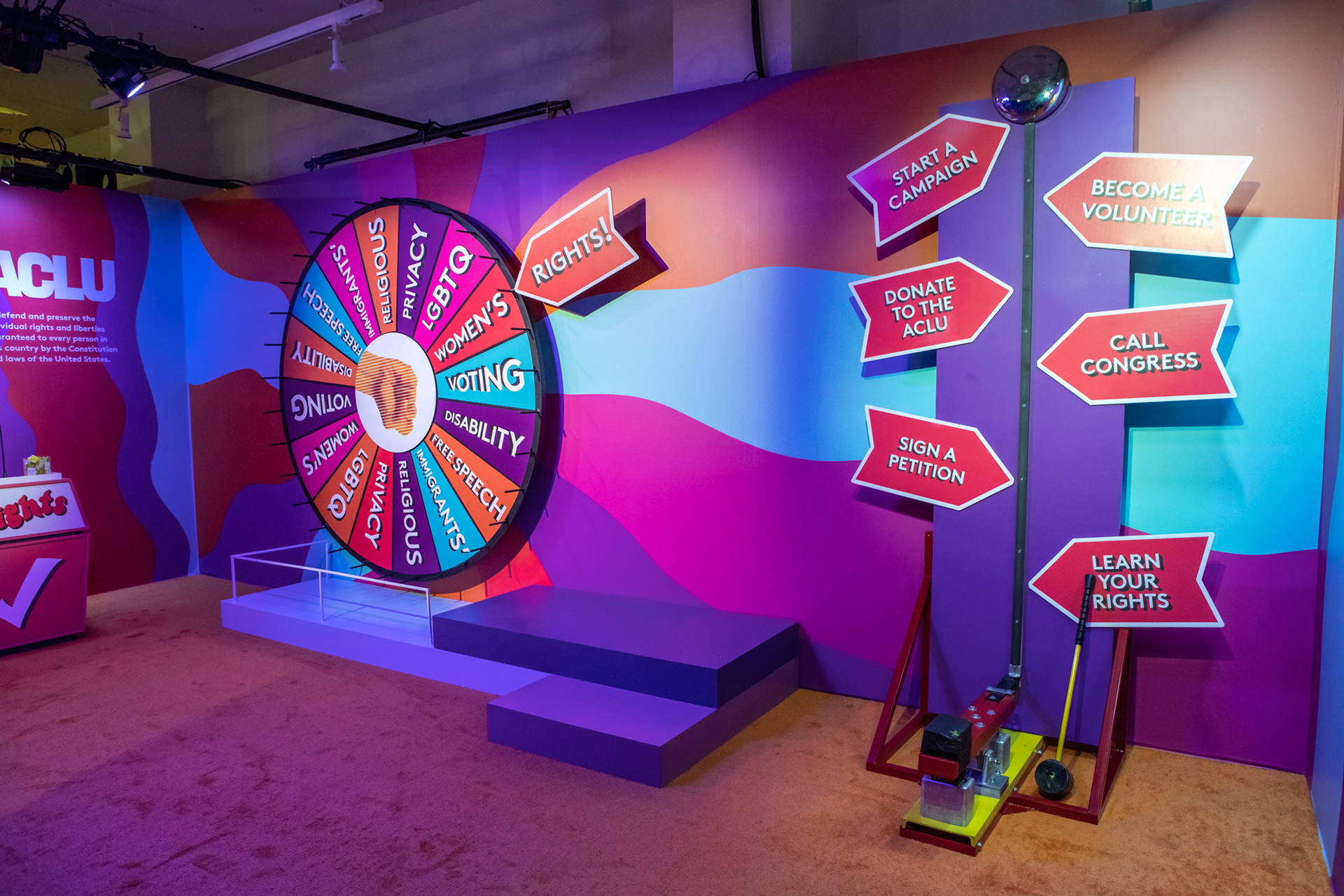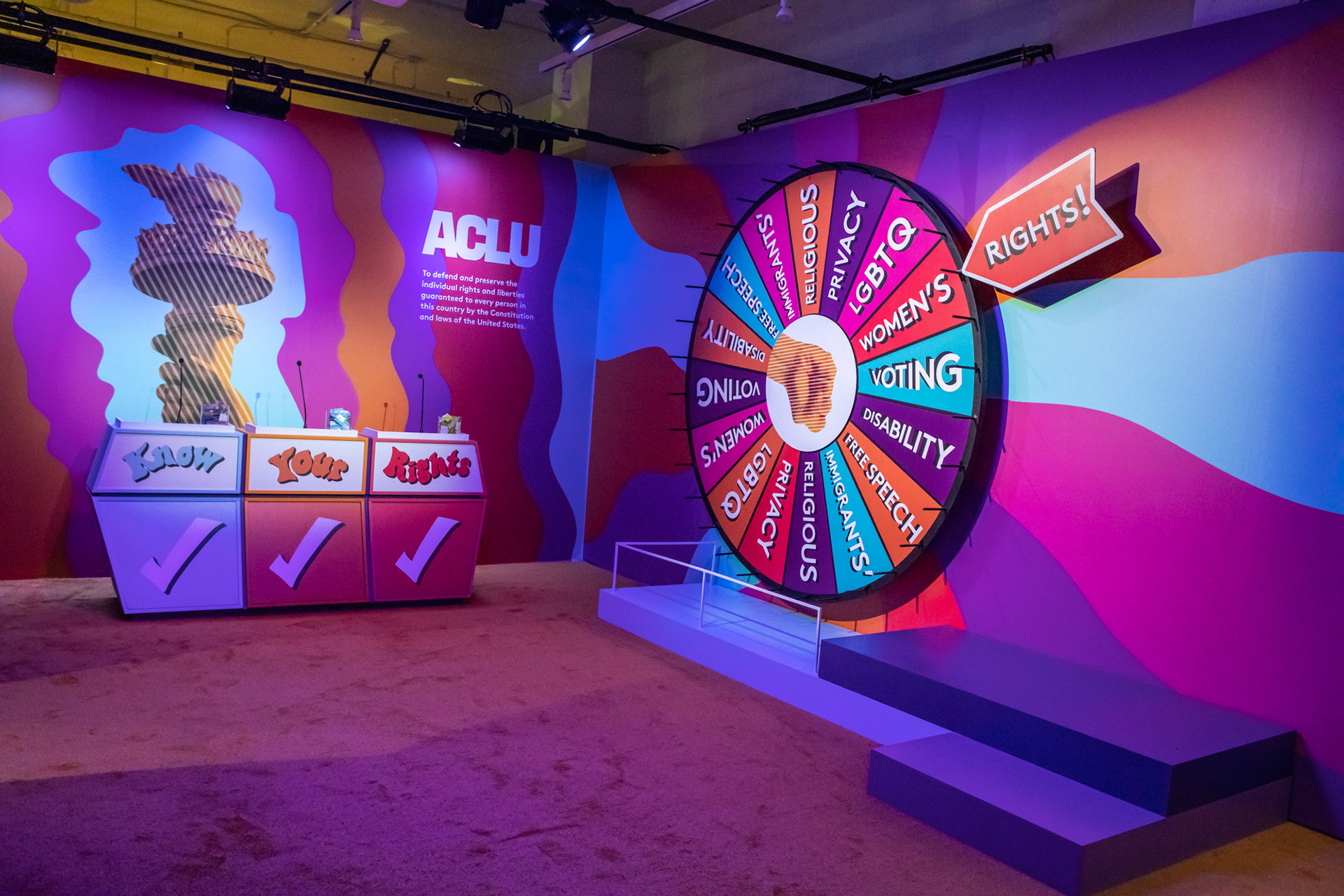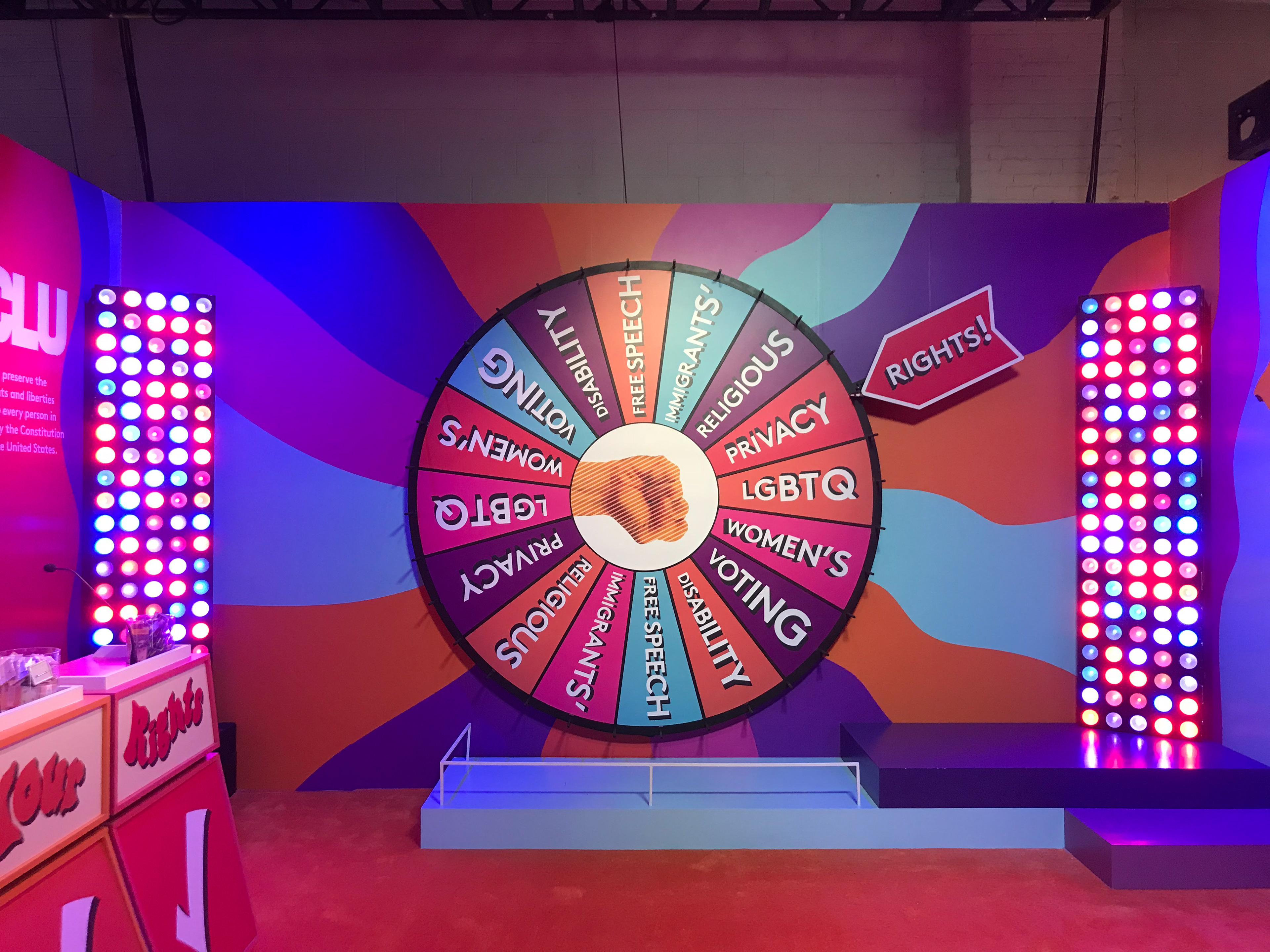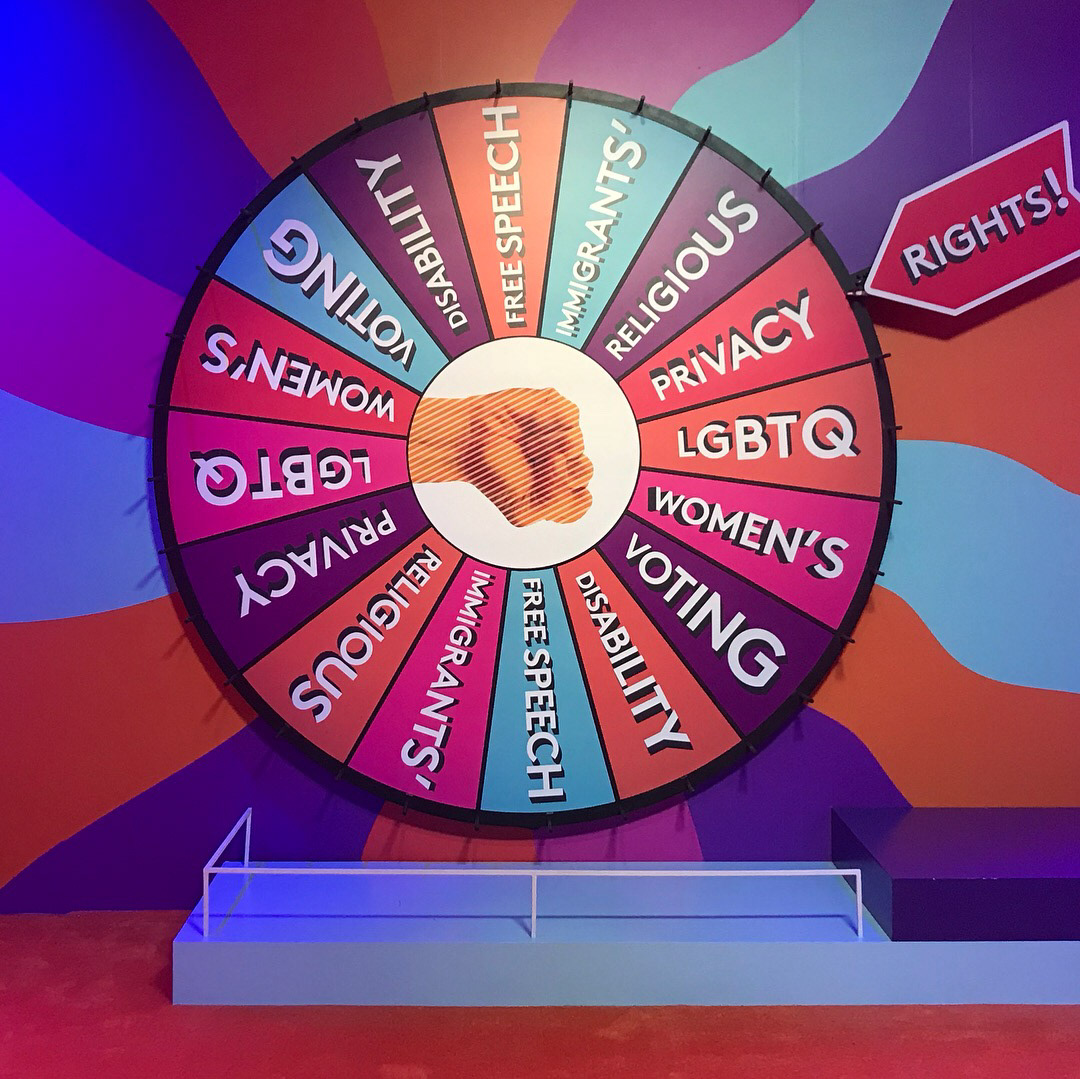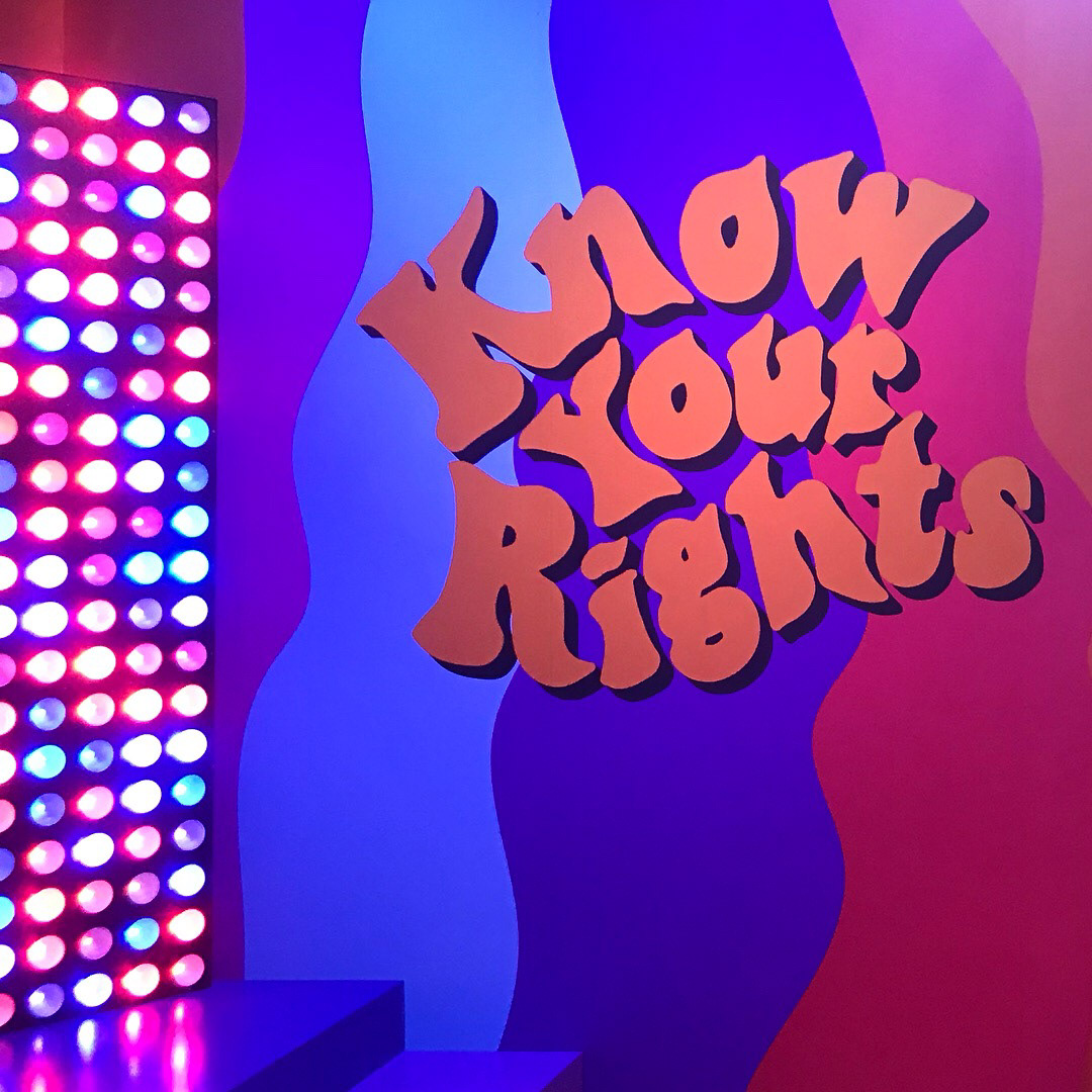 I did all the branding and graphics for this room. Dedicated to educating guests about their rights through The ACLU. Spin the wheel, peel the sticker and learn about your civil rights!