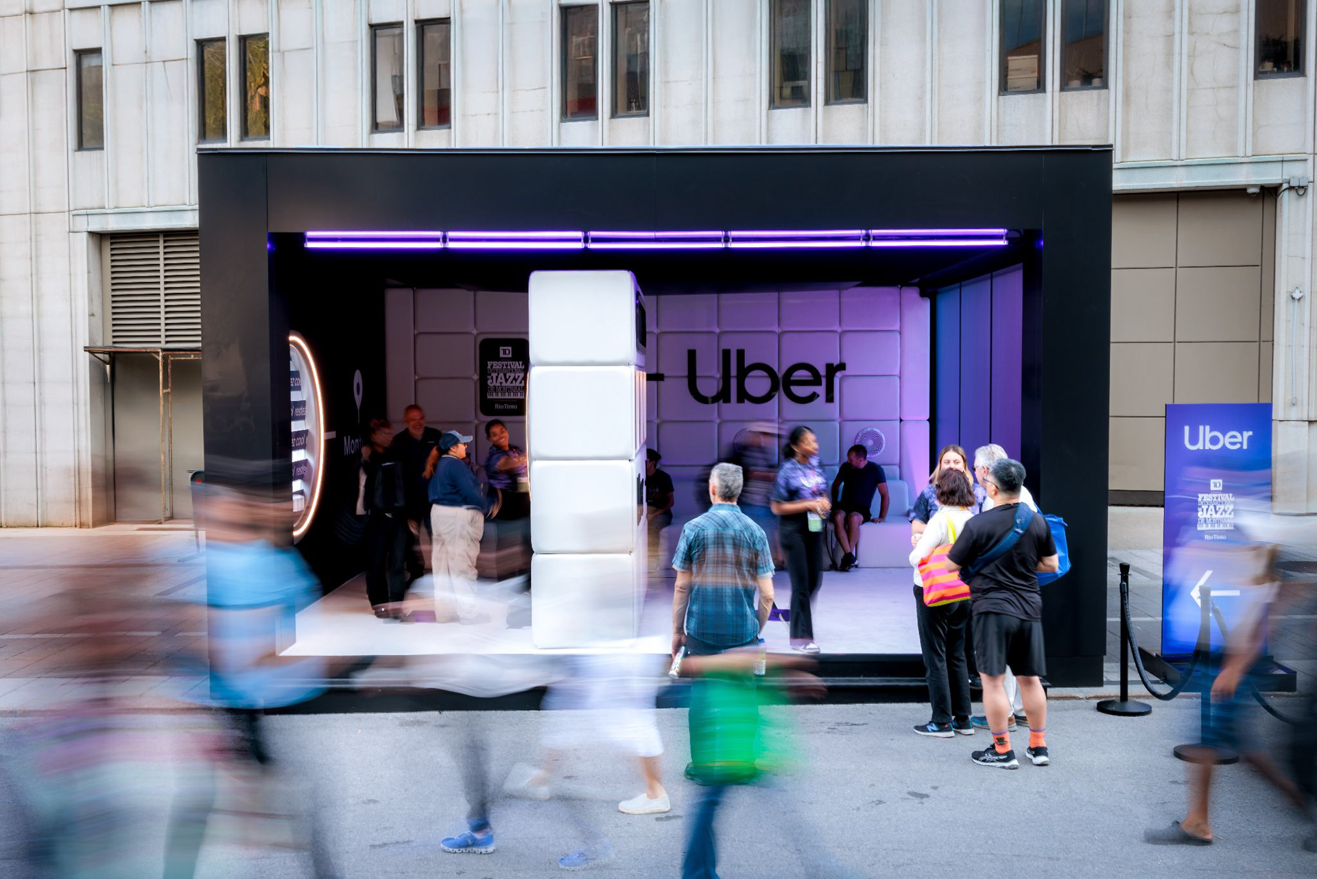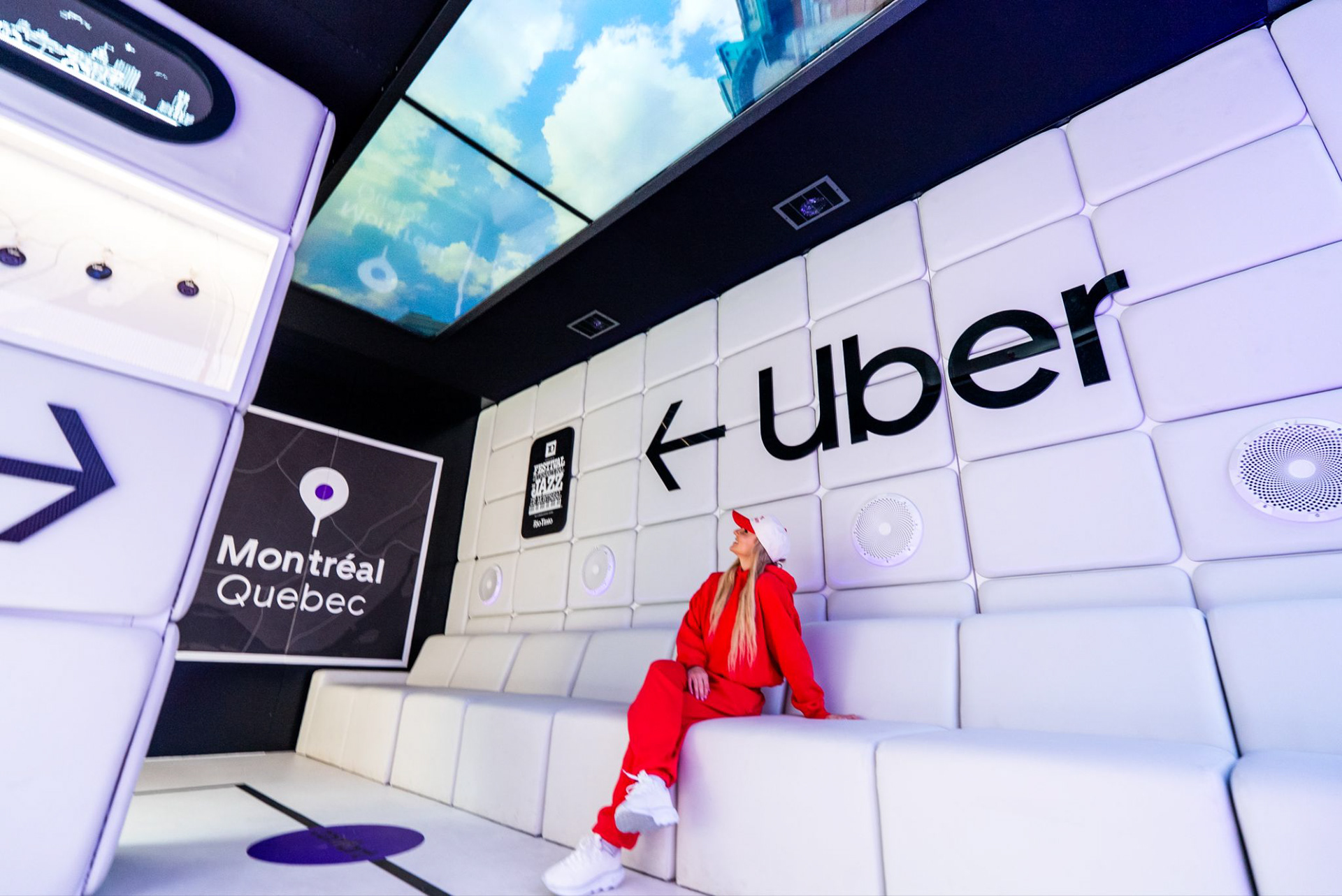 WE CREATED THE JAZZ FESETIVAL'S LARGEST BACKSEAT : 0 Uber’s first experiential activation in Canada touched down at the world’s largest jazz festival. We built a ride-inspired space where guests could recharge, cool off, and kick back. The space was complete with dramatic air vents (yes, hair movement included), AC-powered backseat seating, curated giveaways,